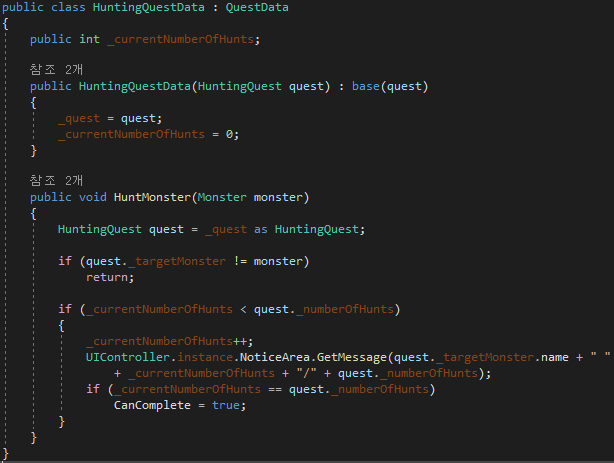 퀘스트를 수락하면 QuestData 생성자를 통해 값이 초기화되어 들어가고 NPC와 대화를 한다거나 몬스터를 잡을 때 조건을 확인하여 조건을 충족하면 값이 변경되도록 설계했다.