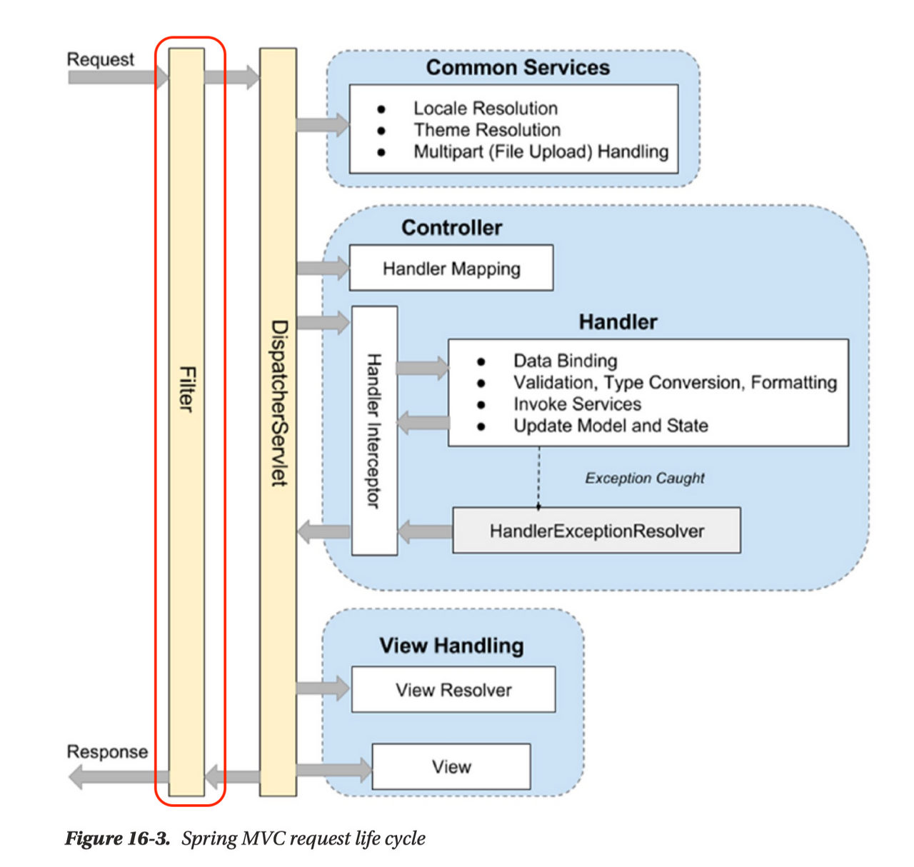 - Web 애플리케이션에서 관리되는 영역으로 Client로 부터 오는 요청과 응답에 대해 최초/최종 단계의 위치이며 이를 통해 요청과 응답의 정보를 변경하거나 부가적인 기능을 추가할 수 있다.